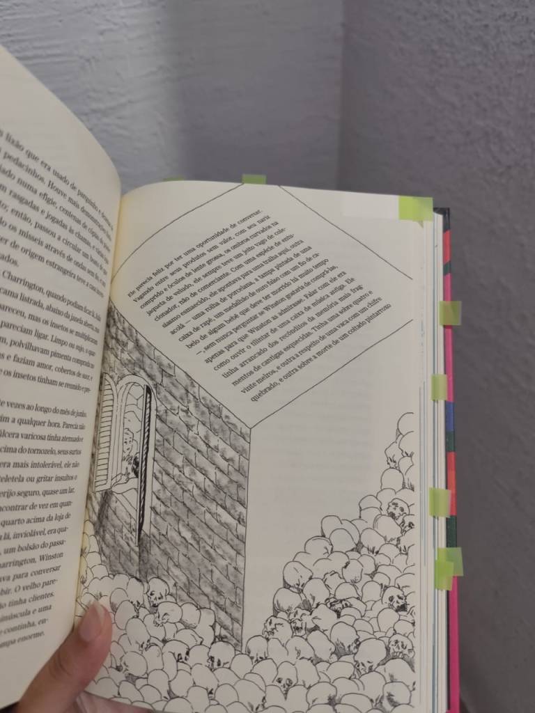 Nem tudo, porém, funciona de forma perfeita na narrativa. Há um trecho em que Winston passa a ler um “livro dentro do livro”, uma longa explicação teórica sobre o funcionamento do regime. Embora importante para a construção do universo, essa parte quebra o ritmo e me afastou da leitura, mesmo quando eu estava completamente imersa na história.